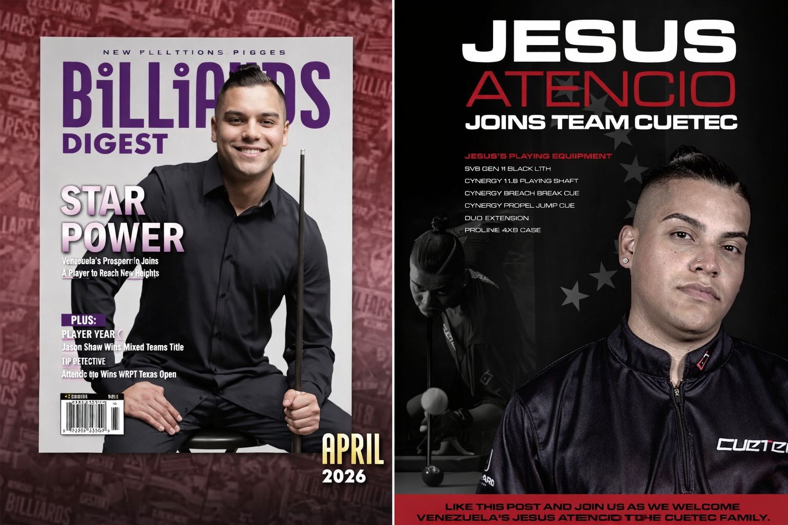 Jesus Atencio landed the cover of the April 2026 Billiards Digest under the headline “Star Power.” Six months ago most casual fans would have drawn a blank if you mentioned the name, but now the kid from Venezuela has become the first to win a World Nineball Tour ranking event, has taken down the world number one at a major, and got the pool forums going back and forth on whether he belongs on the Mosconi Cup team.
